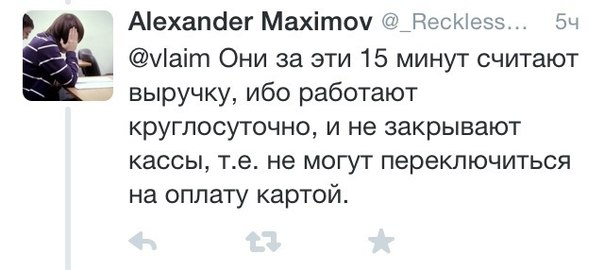 Сегодня зашел в магазин 7Я на Звенигородской. Там висело объявление "Уважаемые покупатели, оплата картами не осуществляется с 23:50 по 00:05 ежедневно".