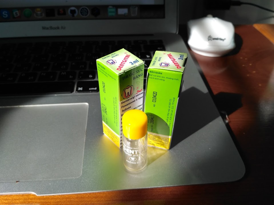 В центре Нячанга, в туристическом районе, есть сеть магазинов-аптек "Сапфир" с русскоговорящими консультантами. На привычную российскую аптеку это не очень похоже: в ней помимо лекарств продаются алкоголь, сувениры, косметика и ещё много всего. Единственное, что там было от зубной боли – местное лекарство Dentgital за 20000 VND (~51 руб) – противовоспалительное средство, содержащее эфирное масло гвоздики. Им можно полоскать полость рта, либо делать компрессы на зуб. Оно неплохо помогало, но эффект от него был непродолжительный. Приходилось чередовать анальгин с парацетамолом, привезенный из Питера в аптечке и прикладывать на время в зубу лед (как оказалось потом, этого делать не следовало) – только тогда боль отходила на второй план и появлялась возможность думать о чем-либо, кроме ноющего зуба.