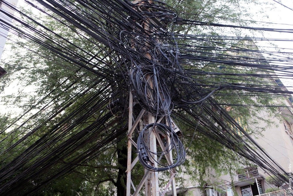 Во Вьетнаме не прячут провода под землю, поэтому большая часть столбов превращается в нечто подобное (фото А.Лебедева из Ханоя). Коммунальные службы не справляются с контролем энергосетей – в крупных городах это уже стало проблемой.